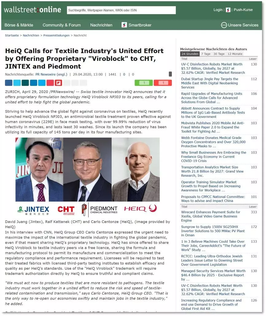 Jintex と HeiQ のグローバルな戦略的協力 - 危機の時代に団結して、流行との戦いに貢献します。