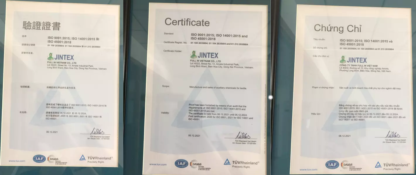 JINTEXベトナム工場は、ISO9001 / ISO14001 / ISO45001の認証を取得しており、お客様に基準を満たす高品質の薬品を提供し続けます。